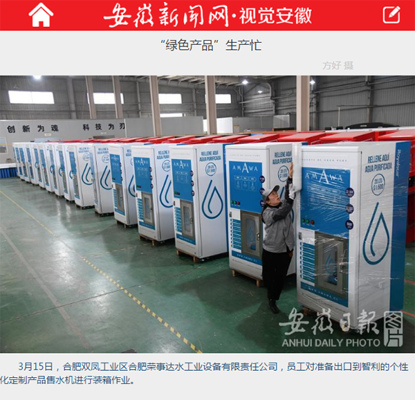 •   昨日,安徽日報報業集團旗下安徽新聞網記者走進合肥榮事達水工業設備有限責任公司,用鏡頭記錄下了凈水生產車間內趕出口訂單的忙碌景象。自今年開工以來,榮事達快速的發展步伐吸引了安徽日報、工商導報、萬家熱線、安徽財經網、今日頭條、江淮時報、歐洲時報、安徽商報等各大主流媒體對企業復工復產和外貿出口情況進行了集中宣傳報道。